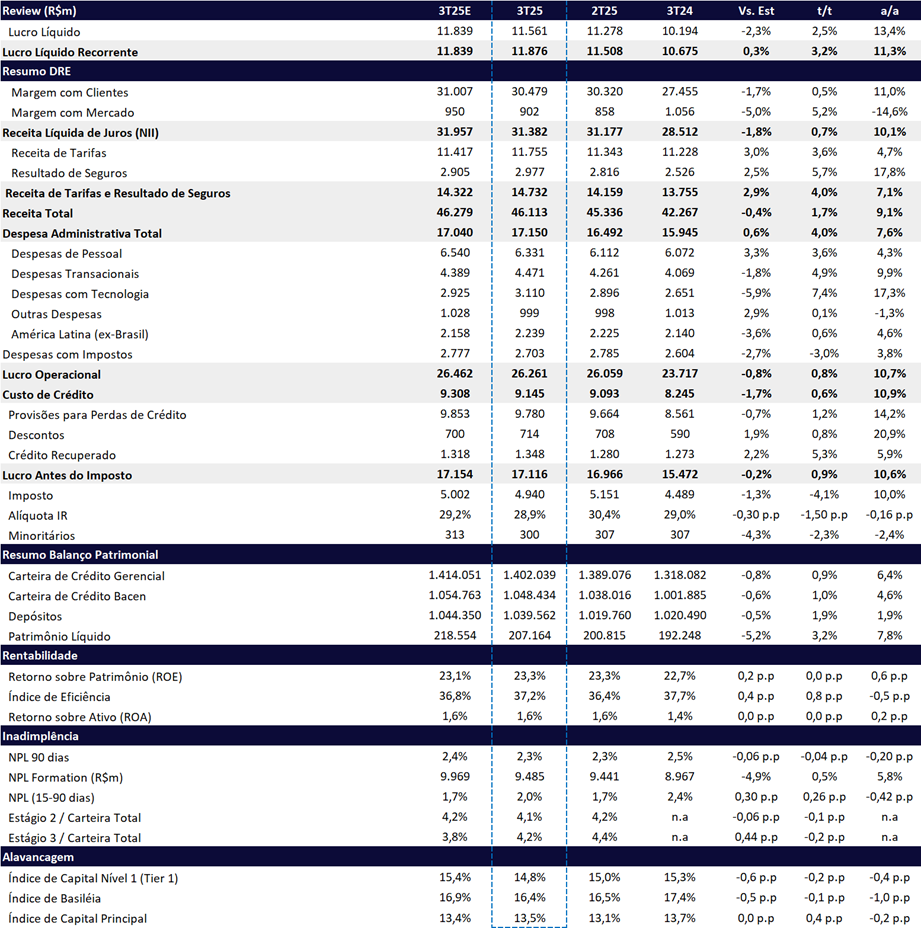 Sem surpresas, o Itaú entregou mais um trimestre sólido e consistente, com lucro líquido recorrente recorde de R$ 11,88 bilhões no 3T25, alta de +3,2% t/t e +11,3% a/a, em linha com o consenso e nossas projeções. Com o 4T sazonalmente mais forte, esperamos que o banco mantenha sua trajetória de crescimento sequencial de lucro e encerre 2025 com expansão anual de 13,6%.