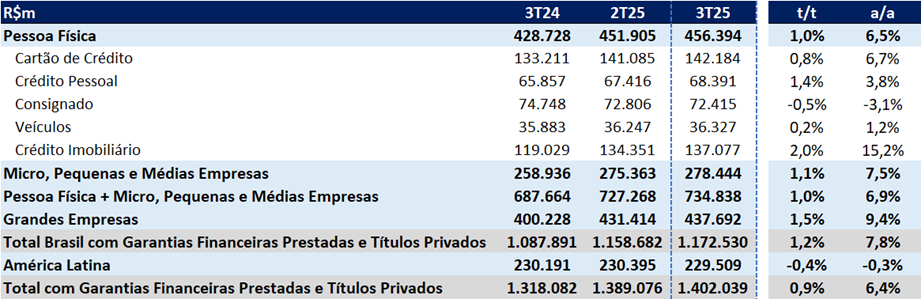- Carteira de Crédito Expandida: R$ 1,4 trilhão (+0,9% t/t; +6,4% a/a), puxada por Grandes Empresas (+9,4% a/a) e Crédito Imobiliário (+15,2% a/a).