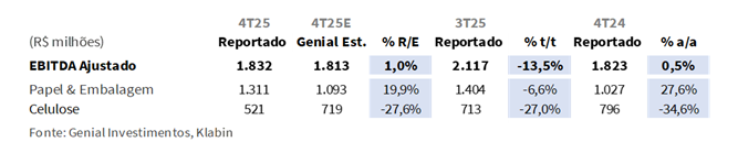 A Klabin divulgou hoje, 11/fev, seus resultados do 4T25. A companhia apresentou números operacionais majoritariamente abaixo das nossas estimativas na divisão de papel, com desempenho particularmente fraco em Kraftliner. Do lado de custos, o Cash COGS/t acima do esperado também contribuiu para um EBITDA mais fraco no negócio de celulose.