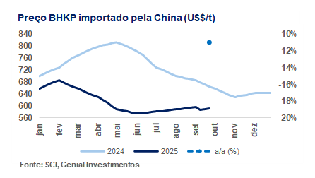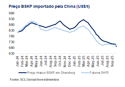 Pelos dados que observamos, a conjuntura para BSKP segue direcionada pelo desequilíbrio global de oferta. A produção estável e o fluxo contínuo de embarques para a China mantiveram estoques elevados nos portos, reforçando a pressão do lado da oferta. No campo da demanda, a baixa recuperação das margens da indústria papeleira levou as fábricas a priorizar otimização do mix de matérias-primas, reduzindo a procura por celulose de fibra longa. Com suporte limitado do downstream, o preço spot perdeu tração: a referência da Arauco BSK em Shandong recuou para ~US$785/t (-3,1% m/m), rompendo a mínima anual.