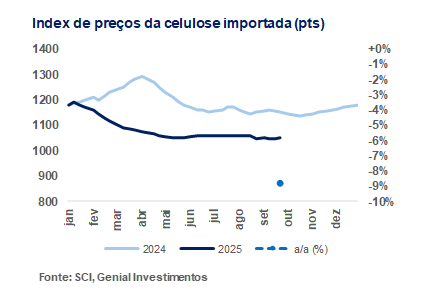Pelo lado dos custos de importação, a última rodada de ofertas de BSKP trouxe corte adicional de -US$20/t, em contraste com reajuste positivo de +US$20/t para BHKP. Nosso entendimento é de que a divergência sugere que, entre Out.–Nov., o spread entre as duas fibras se estreite ainda mais, podendo ficar abaixo de ~US$168/t no 4T25E. O cenário reforça que, mesmo em ambiente de suporte marginal sazonal, a margem relativa da BSKP frente à BHKP deve seguir encolhendo, restringindo oportunidades de arbitragem.