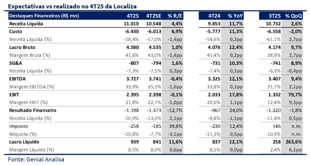 A Localiza reportou um 4T25 com desempenho operacional consistente e lucro líquido acima das nossas estimativas e em linha com o consenso de mercado. A receita veio acima do esperado, as margens operacionais mostraram expansão relevante e o resultado confirmou a melhora gradual da qualidade operacional, ainda que o resultado financeiro tenha permanecido pressionado.