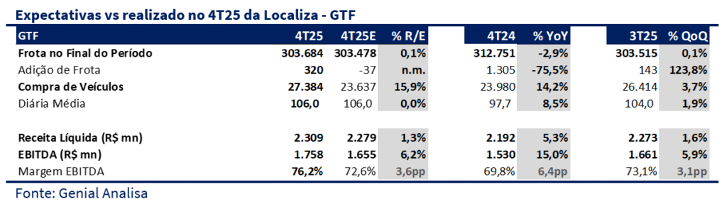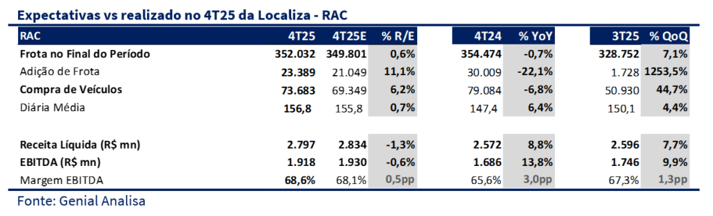 No RAC, a receita líquida foi de R$ 2,8 bilhões (+8,8% a/a; +7,7% t/t), levemente acima da nossa estimativa. O EBITDA atingiu R$ 1,9 bilhão (+13,8% a/a; +9,9% t/t), com margem de 68,6% (+3,0pp a/a; +1,3pp t/t). A diária média manteve expansão anual (+5,7% a/a; +3,8% t/t), mesmo após desaceleração ao longo de 2025, indicando que o repasse tarifário segue acontecendo, ainda que em ritmo mais moderado. A frota final ficou praticamente estável na comparação anual (-0,7% a/a; +7,1% t/t), refletindo postura mais seletiva na expansão.