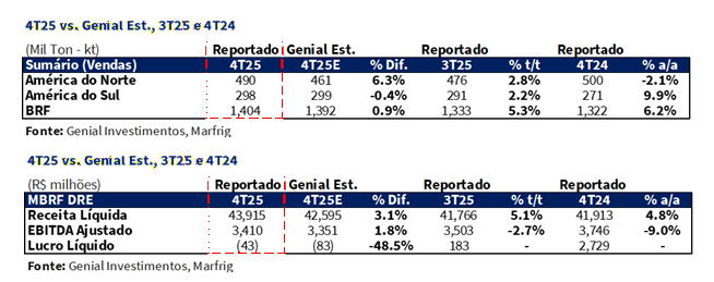 (i) BRF Doméstico: Vendas de 818Kt (+4,8% vs. Est.; +5,9% t/t; +4,8% a/a), impulsionadas pela demanda da temporada festiva e pelas vendas recordes de alimentos processados; preço realizado em R$12,2/kg (flat vs. Est.; +4,5% t/t; +3,1% a/a), refletindo preços mais firmes no MD e a normalização do mix de exportações com a reabertura do mercado chinês; (ii) BRF Externo: Embarques de 586Kt (-4,1% vs. Est.; +4,5% t/t; +8,3% a/a), abaixo da estimativa, arrastados pelo excesso de oferta na Turquia; preço realizado em R$13,2/kg (-1,6% vs. Est.; +1,4% t/t; -13,6% a/a), pressionado pelo câmbio e pelos desafios no mercado turco; (iii) BRF Consolidado: COGS/kg em R$9,6/kg (-0,7% vs. Est.; +4,2% t/t; -2,6% a/a), levemente melhor do que o projetado; EBITDA de R$2,6b (+1,8% vs. Est.; +4,5% t/t; -5,9% a/a) e margem de 14,9% (+0,3p.p. vs. Est.; -0,6p.p. t/t; -1,1p.p. a/a), ainda acima da média histórica de ~12% nos últimos 5A; (iv) América do Norte: Preço realizado em US$7,5/kg (-0,1% vs. Est.; -2,1% t/t; +16,9% a/a), em linha; volume de 490Kt (+6,3% vs. Est.; +2,8% t/t; -2,1% a/a), acima do nosso modelo apesar dos níveis historicamente baixos do rebanho; EBITDA de US$28m (-9,9% vs. Est.; -62,7% t/t; -55,2% a/a) e margem de 0,8% (-0,1p.p. vs. Est.; -1,3p.p. t/t; -1,2p.p. a/a), pressionados pelos custos do gado, com os spreads esperados para persistir ao longo do 26E antes de uma inflexão em 28E; (v) América do Sul: Embarques de 298Kt (-0,4% vs. Est.; +2,2% t/t; +9,9% a/a), em linha; preço realizado em R$21,8/kg (+5,8% vs. Est.; +12,1% t/t; +2,4% a/a), acima da nossa projeção; EBITDA de R$682m (+4,9% vs. Est.; +8,5% t/t; +2,8% a/a) e margem de 10,5% (flat vs. Est.; -0,6p.p. t/t; -1,0p.p. a/a), em nível saudável de dois dígitos apesar das pressões nos custos do gado; (vi) EBITDA Consolidado de R$3,4b (+1,8% vs. Est.; -2,6% t/t; -9,0% a/a), margem de 7,8% (-0,1p.p. vs. Est.; -0,6p.p. t/t; -1,2p.p. a/a), impulsionado pela compressão sazonal da Marfrig na América do Norte, parcialmente compensada pelo desempenho resiliente da BRF; (vii) Mesmo reconhecendo os riscos cíclicos associados aos segmentos de aves e alimentos processados, acreditamos que os vetores de valor da fusão permanecem subapreciados, mantendo o case coerente e ainda subvalorizado. Portanto, mantemos nossa recomendação de COMPRAR, com um Target Price 12M em R$23,00, implicando um upside de +33,9%.