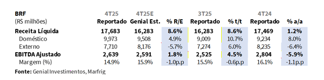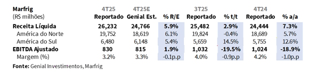 A MBRF divulgou seus resultados do 4T25 hoje (18/mar) após o fechamento do mercado. A companhia reportou uma Receita Líquida de R$43,9b (+3,1% vs. Est.), avançando +5,1% t/t e +4,8% a/a, acima das projeções, refletindo um desempenho mais forte do que o esperado em Marfrig, que veio em R$26,2b (+5,9% vs. Est.; +2,9% t/t; +7,3% a/a), impulsionado por uma alta significativa de preços na América do Sul de R$21,8/kg (+5,8% vs. Est.; +12,1% t/t; +2,4% a/a) e um volume acima do esperado na América do Norte de 490Kt (+6,3% vs. Est.; +2,8% t/t; -2,1% a/a). No lado da BRF, a receita líquida veio flat vs. nossa projeção em R$17,7b (+8,6% t/t; +1,2% a/a), já que o beat doméstico foi integralmente compensado pelo shortfall externo.