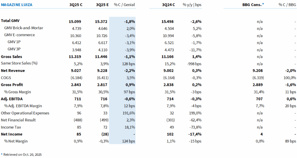 O e-commerce, por outro lado, recuou para R$ 10,4 bilhões, queda de 5,8% a/a e 3,4% abaixo do que projetávamos, com o GMV 1P em R$ 6,4 bilhões, recuo de 1,7% a/a e 3,1% abaixo da Est. Genial, e o GMV 3P caindo 11,7% a/a, para R$ 3,9 bilhões, 3,9% abaixo da nossa projeção. Em resumo, o físico ainda segura parte do balanço, enquanto o online continua sendo o principal vetor de frustração.