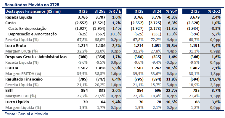 A Movida entregou mais um trimestre de sólida execução operacional, com EBITDA de R$ 1,5 bilhão — 5,9% acima das nossas estimativas e 19% superior ao 3T24. A margem EBITDA consolidada atingiu 39,9%, avanço de 6,3 p.p. em relação ao mesmo período do ano anterior, refletindo maior eficiência e controle de custos. O resultado foi impulsionado principalmente pela performance consistente das divisões de locação (RAC e GTF), que compensaram o menor volume de vendas de seminovos. O lucro líquido somou R$ 70 milhões, 9% acima da nossa projeção, beneficiado por uma alíquota efetiva de imposto positiva, mas ainda limitado pelo custo financeiro elevado, que subiu 34% a/a e totalizou R$ 795 milhões