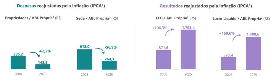 Enxergamos as sinergias das expansões, eventos, optimização do mix de lojas e revitalizações históricas de forma construtiva, uma vez que refletem tanto a elevada demanda por parte dos lojistas quanto o histórico comprovado da companhia na geração de retornos superiores. Do ponto de vista operacional, os ganhos de eficiência são claros com o Lucro Líquido por ABL própria tendo um crescimento real de 159,6% de 2008 até 2025, enquanto as despesas propriedades como percentual do NOI recuaram para 5,4% em 2025, frente a 14,2% em 2018. Esse conjunto de métricas reforça nossa visão de que a estratégias da empresa não apenas gera valor, mas tem em seu core disciplina do ponto de vista de rentabilidade e controle de custos.