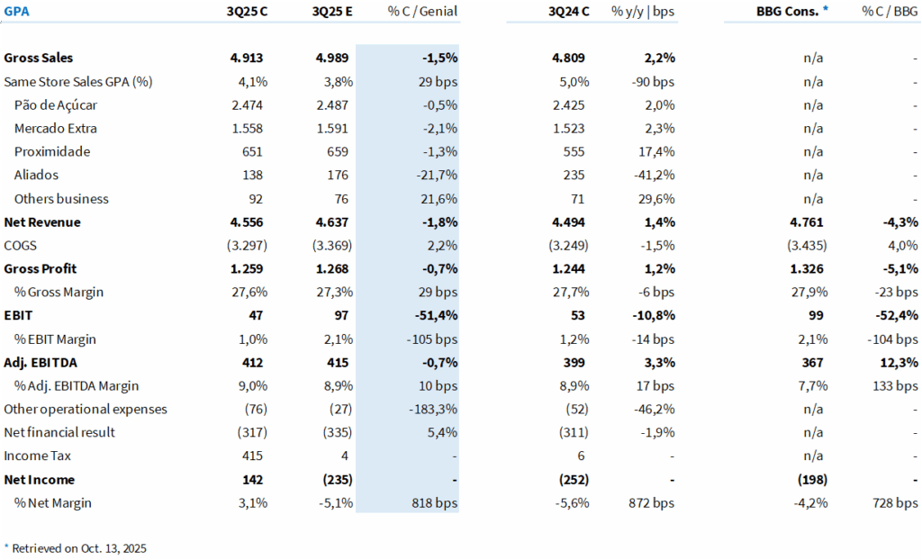 Encerrado o pregão desta terça-feira (04/nov), o GPA divulgou seus resultados do 3T25. A mensagem central é parecida com a do início do ano: a operação continua entregando o básico com disciplina, sobretudo em margem e despesas, mas o lucro do trimestre foi “turbinado” por um evento contábil de imposto, e não por uma virada estrutural do negócio.
