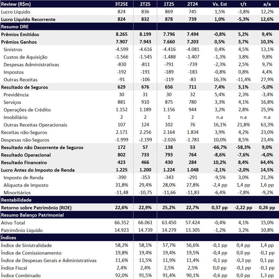 - Prêmios Emitidos: Totalizaram R$ 480 milhões, praticamente estáveis t/t (–0,1%) e com crescimento de +12,9% a/a, sustentados pelo bom desempenho de Vida Coletivo e Prestamista.