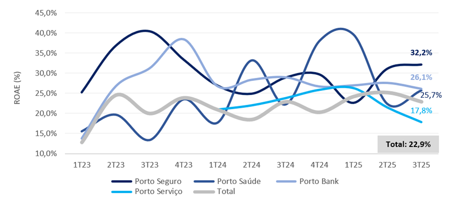 A Porto Saúde foi novamente o destaque, com lucro de R$ 126 milhões (+19,7% t/t; +64,7% a/a) e ROE de 25,7% (+3,4 pp t/t; +3,5 pp a/a), refletindo forte expansão de prêmios e sinistralidade controlada.