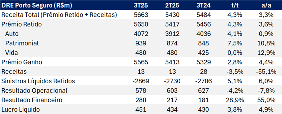 DRE Porto Seguro 3T25 (R$m): Resultado Financeiro Impulsiona Lucro