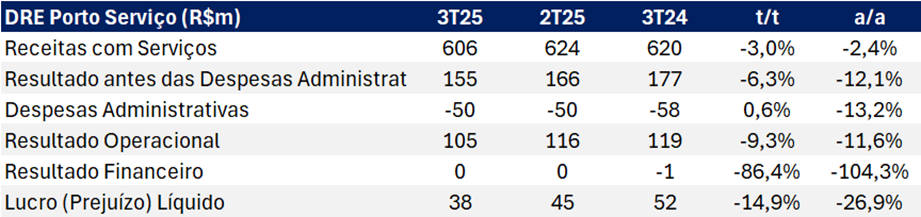 DRE Porto Serviço 3T25 (R$m): Desempenho Mais Fraco no Trimestre