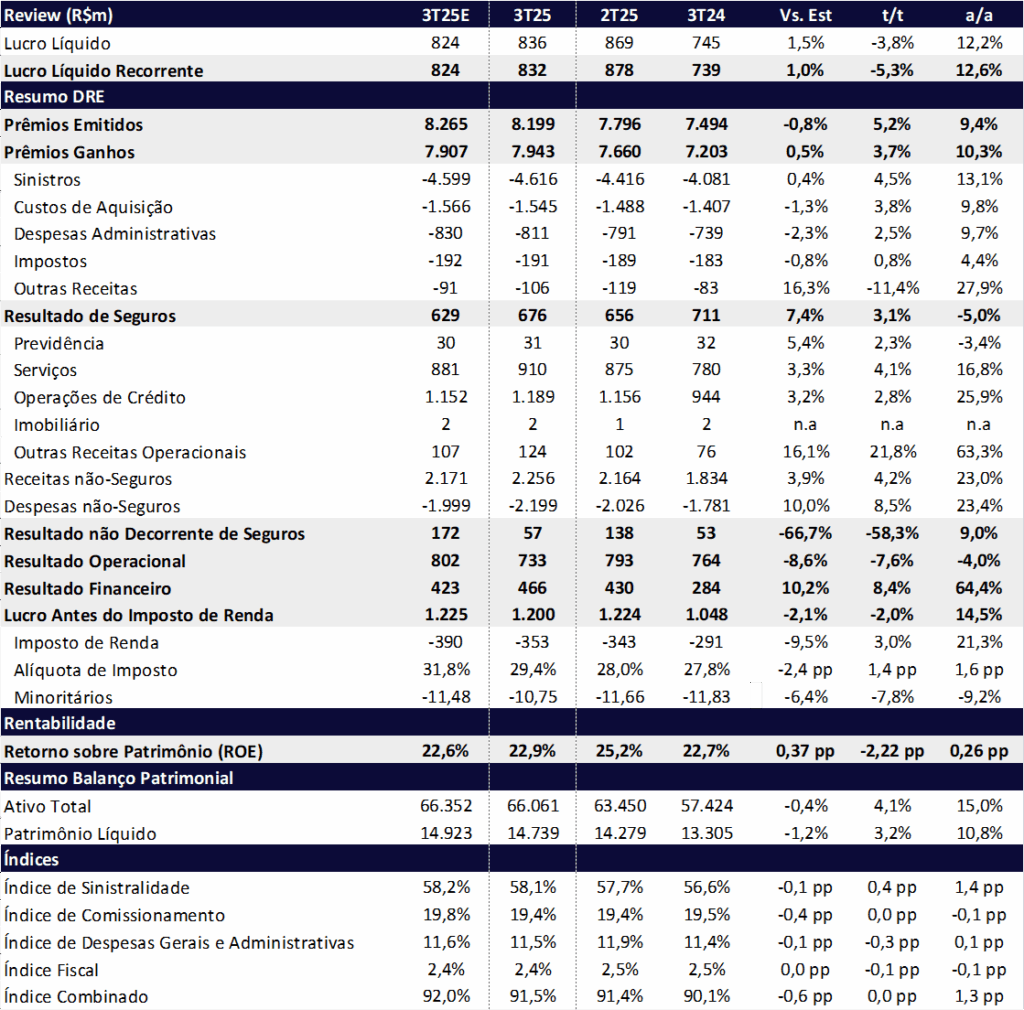 - Vida: registrou estabilidade no trimestre (-0,1% t/t) e avanço de +12,9% a/a, totalizando R$480 milhões no 3T25, beneficiado principalmente pelas carteiras de Prestamista e Vida Coletivo.