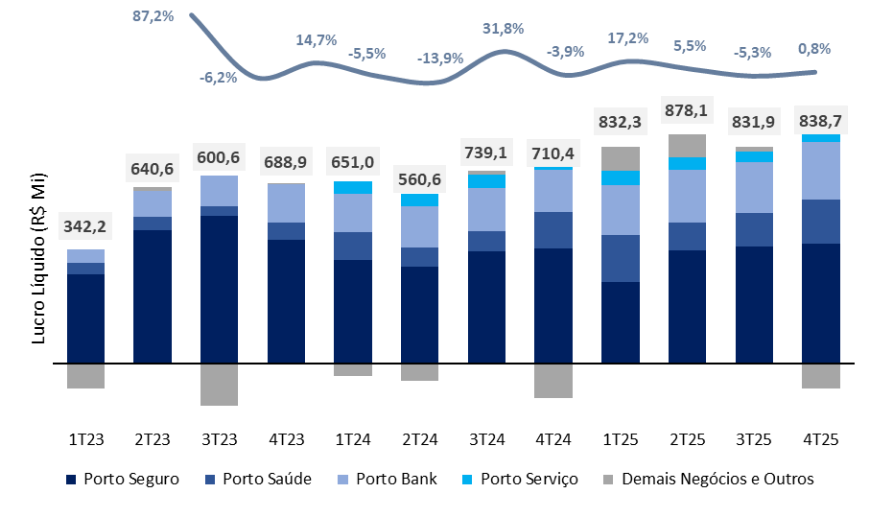 Na principal vertical, Seguro Auto segue apresentando rentabilidade mais pressionada neste estágio do ciclo, refletindo crescimento mais moderado e cenário mais competitivo. Ainda assim, a administração sinaliza expectativa de melhora do ambiente competitivo ao longo de 2026. As demais verticais — excluindo Seguro Auto — mantiveram participação relevante e estável no lucro consolidado, representando 45,7% do total no 4T25 (vs. 45,5% no 3T25), com destaque para a contribuição consistente de Porto Saúde, Porto Bank e Porto Serviço.