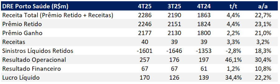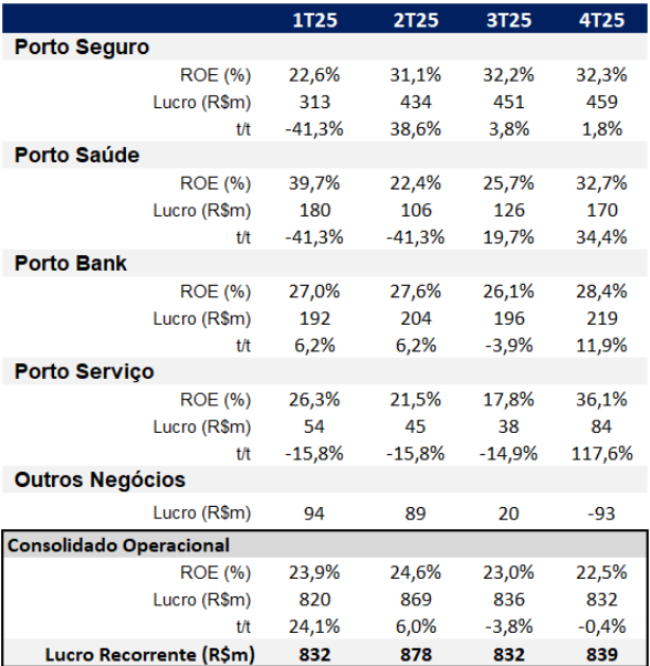 - Porto Saúde: principal motor de crescimento do bottom line, com forte expansão de prêmios e ganho de escala operacional.