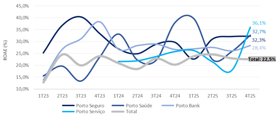 Ainda assim, com a rentabilidade consolidada sustentada em patamares elevados, a Porto segue direcionando crescimento para produtos de maior margem, o que tem permitido a manutenção de ROE estruturalmente acima de 20%. No 4T25, o ROE consolidado atingiu 22,1% (–0,83 pp t/t; +1,21 pp a/a), marcando o sexto trimestre consecutivo acima desse patamar, reforçando a consistência do modelo de negócios.