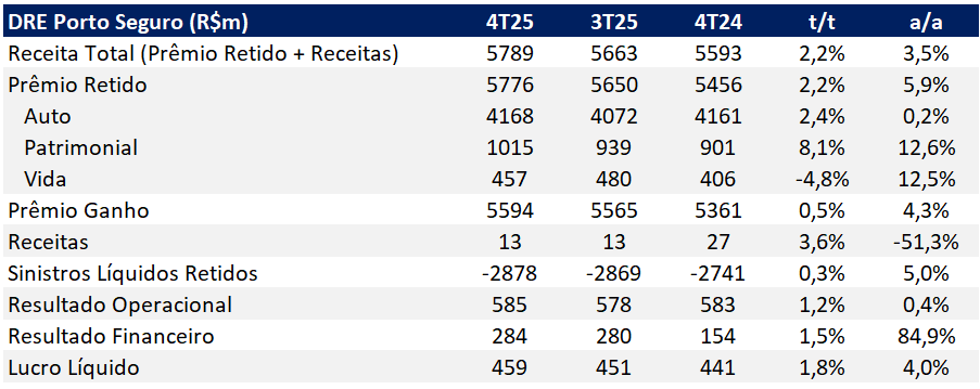 DRE Porto Seguro 4T25 (R$m): Resultado Financeiro Impulsiona Lucro