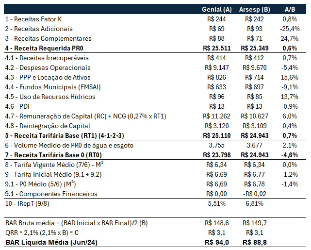 Os Fatos | Via fato relevante, a empresa anunciou o resultado da sua primeira revisão tarifária pós-privatização. Em linhas gerais, achamos o resultado em linha com nossas estimativas – naturalmente, a prévia anunciada recentemente nos ajudou a obter números mais próximos (para maiores informações, leia Sabesp (SBSP3) | Base de Ativos de 2024 aprovada! O que isso significa?). Como podemos perceber, Os desvios em relação aos nossos números foram mínimos em comparação com os números regulatórios. Nossa base de remuneração ficou ligeiramente acima do publicado (R$11,2 bilhões vs R$10,6 bilhões na ARSESP), o que acabou sendo compensado nas demais contas para cálculo da receita requerida.
