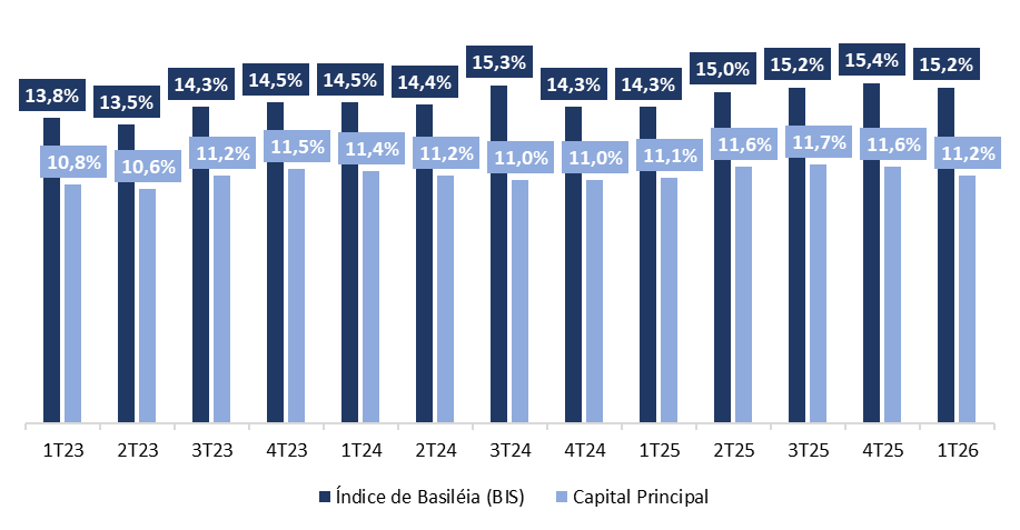 - Capital principal (CET1): ficou em 11,2% (-0,3pp t/t), pressionado pela implementação gradual do RWA Operacional e pelo início do consumo de DTAs no trimestre.