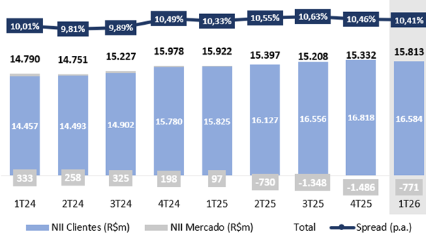 - NII Total: Alta de +3,1% t/t (-0,7% a/a), com NII Mercado registrando expressiva recuperação sequencial para -R$771m (vs. -R$1,486bi no 4T25). NII Clientes recuou -1,4% t/t (+4,8% a/a) por menos dias úteis e efeito técnico da Resolução 4.966 sobre deduções com correspondentes bancários.