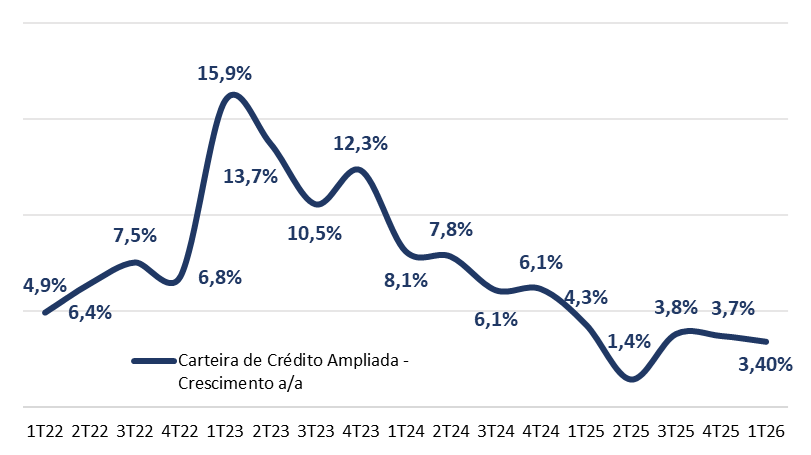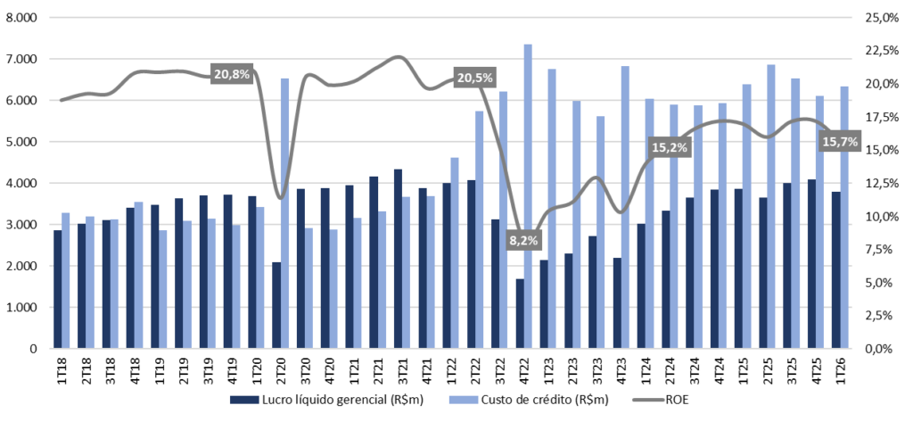 O quadro operacional, no entanto, é consideravelmente mais construtivo do que o lucro sugere. O resultado antes de impostos (EBT) subiu +5,4% t/t, sustentado pela recuperação do NII Mercado e pela normalização das outras despesas operacionais, que reverteram os one-offs do 4T25. O índice de eficiência melhorou 110bps t/t para 37,7%, as despesas seguem rigorosamente controladas (+0,9% a/a, bem abaixo da inflação) e a receita total avançou +0,8% t/t. O lucro antes de imposto anualizado cresceu acima de 20%, sinal de que a dinâmica operacional segue favorável.