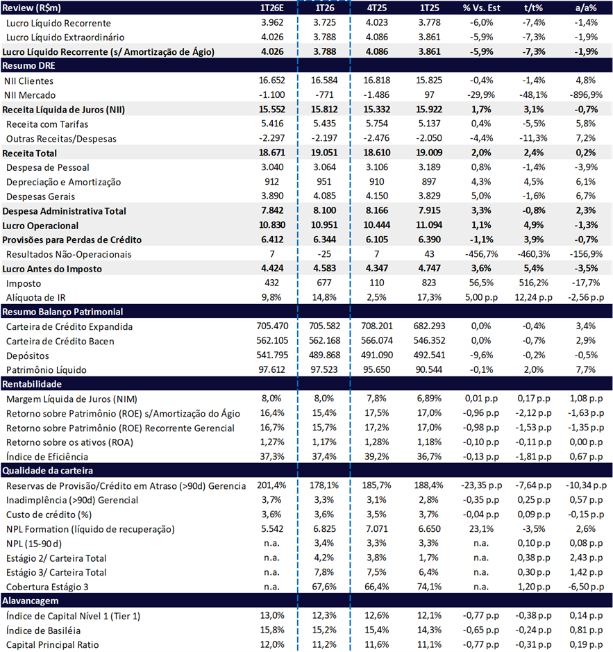 O Santander Brasil reportou um lucro líquido gerencial de R$ 3,79 bilhões no 1T26 (-7,3% t/t; -1,9% a/a), -5,9% abaixo das nossas estimativas de R$ 4,03 bilhões e do consenso. O resultado foi penalizado pela sazonalidade sequencial e principalmente pela normalização da alíquota efetiva de imposto — que saltou frente ao 4T25, beneficiado por maior volume de JCP. O ROE recuou para 15,7% (-1,5pp t/t; -1,3pp a/a), patamar que a gestão reconhece não ser estrutural, reiterando a trajetória de busca aos 20%.