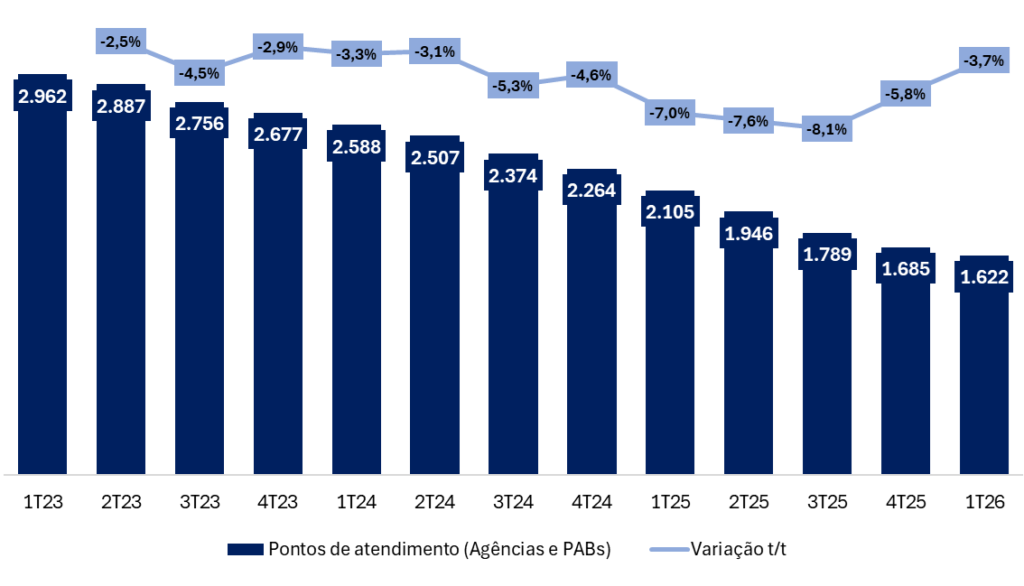 Número de Pontos de Atendimento (# de Agência e PABs; variação % t/t): Em Queda Contínua
