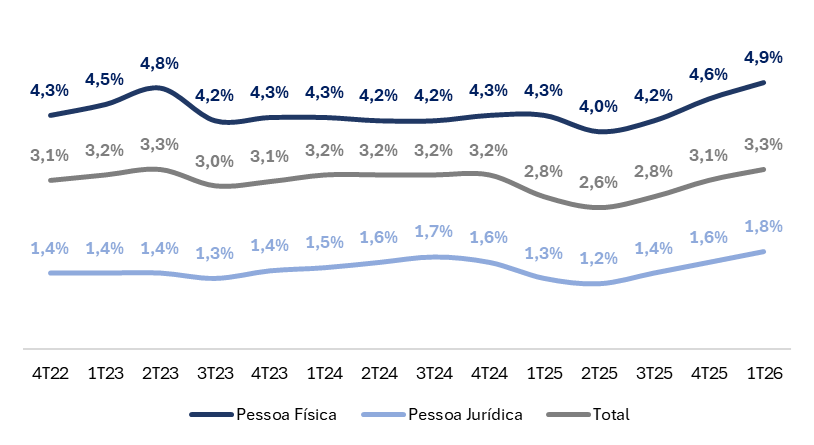 - Inadimplência (acima de 90 dias): subiu para 3,3% (+0,2pp t/t; +0,6pp a/a), com alta concentrada em Pessoa Física baixa renda e PMEs menores, num movimento que reflete tanto deterioração real quanto efeitos técnicos da nova metodologia de write-off introduzida pela Resolução 4.966.