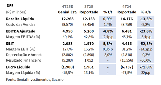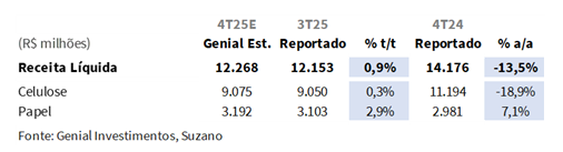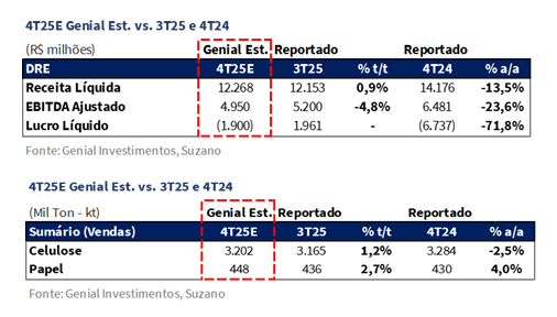 Projetamos Receita Líquida consolidada de R$12,3b Genial Est. (+0,9% t/t; -13,5% a/a), refletindo um ambiente de preços ainda desafiador no segmento de celulose, que segue respondendo por ~75% da receita total. Na comparação sequencial, o leve avanço deve ser explicado por volumes de celulose amplamente estáveis e por um nível marginalmente maior de embarques em papel, enquanto a dinâmica de preços permanece como o principal fator limitante.