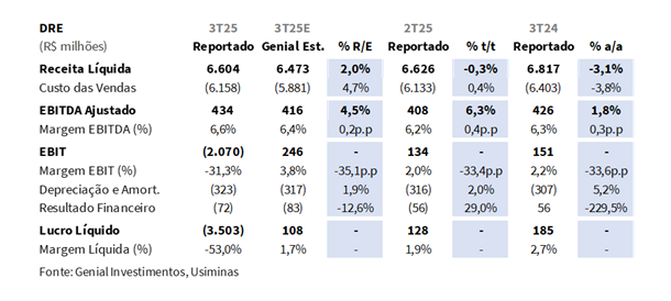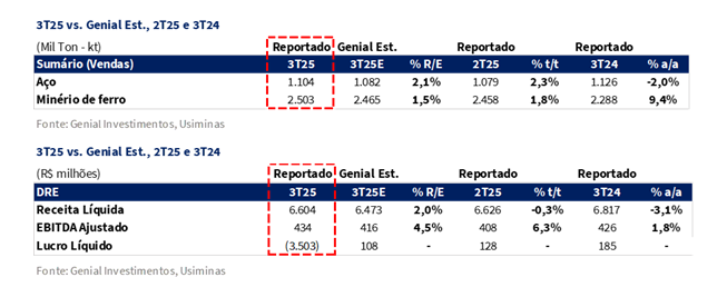 (i) As vendas de aço (MD+ME) totalizaram 1.104Kt (+2,1% vs. Genial Est.), avançando +2,3% t/t e recuando -2,0% a/a, ligeiramente acima do esperado, impulsionadas pelo redirecionamento parcial de volumes para exportação e pela resiliência do segmento automotivo doméstico; (ii) O preço realizado(MD+ME) foi de R$5.239/t (-0,3% vs. Genial Est.), com retração de -3,6% t/t, refletindo o efeito combinado de um mix geográfico menos favorável nas exportações e da desvalorização USD/BRL (-4% t/t), que pressionou a conversão em BRL; (iii) A divisão de mineração (MUSA) apresentou embarques de 2.503Kt (+1,5% vs. Genial Est.), crescendo +1,8% t/t e +9,4% a/a, desempenho levemente superior às projeções, e preço de R$380/t (+0,2% vs. Genial Est.), expandindo +2,5% t/t, sustentado pelo repasse parcial da alta do índice IODEX 62% Fe (+4% t/t); (iv) O COGS/t da siderurgia foi de R$4.980/t (+0,1% vs. Genial Est.), com queda de -2,9% t/t e -4,2% a/a, beneficiado pela redução nos preços de insumos e pela desvalorização USD/BRL, parcialmente compensadas por recomposição operacional; (v) EBITDA atingiu R$434m (+4,5% vs. Genial Est.), avançando +6,3% t/t e +1,8% a/a, impulsionado por volumes acima do previsto em ambas as divisões e custos controlados na siderurgia; (vi) Prejuízo líquido de -R$3,5b (vs. +R$108m Genial Est.), revertendo o lucro do 2T25 e 3T24, afetado por efeitos não caixa de impairment e reversão fiscal, que totalizaram R$3,6b no trimestre; excluídos esses efeitos, o lucro líquido ajustado seria de R$108m (+3,8% vs. Genial Est.); (vii) O viés sobre medidas antidumping comentadas pelo management confirmou nossa presunção de que não haverá decisões do MDIC ainda este ano; reiteramos nossa recomendação de MANTER com Target Price 12M de R$4,75, implicando em um downside de -2,9%.