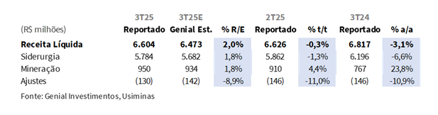 A Receita Líquida consolidada atingiu R$6,6b (+2,0% vs. Genial Est.), recuando -0,3% t/t e -3,1% a/a, principalmente pela dinâmica de preços na divisão de aço, mas ainda assim ficando um pouco acima do projetado, impulsionada por melhores volumes em ambas as divisões, refletindo o avanço marginal das vendas de aço (+2,1% vs. Genial Est.) e da mineração (+1,5% vs. Genial Est.).