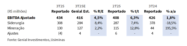 O EBITDA Ajustado consolidado somou R$434m (+4,5% vs. Genial Est.), subindo +6,3% t/t e +1,8% a/a, diante do maior nível de embarques em ambas as divisões e pela redução do COGS/t da divisão de aço. A divisão de aço marcou um EBITDA de R$308m (+8,4% vs. Genial Est.), apresentando elevação de +7,4% t/t, mas recuando -18,5% a/a, refletindo o aumento dos embarques (+2,1% vs. Genial Est.) e a dinâmica de custos em linha com o previsto.