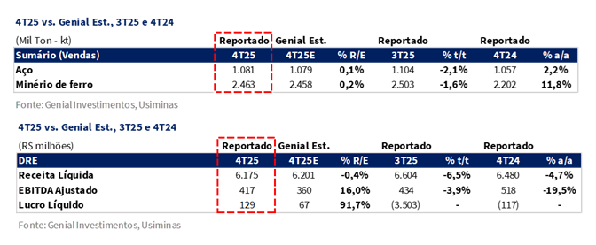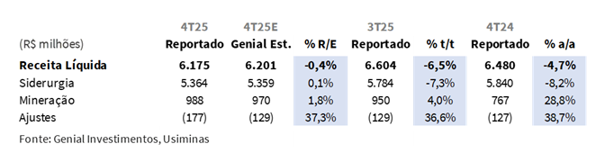 A companhia reportou Receita Líquida de R$6,2b (-0,4% vs. Genial Est.; -6,5% t/t; -4,7% a/a), com embarques de aço totalizando 1.081Kt (+0,1% vs. Est.) e mineração (MUSA) atingindo 2.463Kt (+0,2% vs. Est.), ambos levemente em linha com nossas projeções. Os preços realizados de aço (MD+ME) ficaram em R$4.962/t (em linha vs. Est.; -5,3% t/t; -10,2% a/a), refletindo pressão de importados e sazonalidade de mix, enquanto a mineração registrou R$401/t (+1,6% vs. Est.; +5,7% t/t; +15,2% a/a), beneficiada pelo benchmark 62% Fe mais forte.
