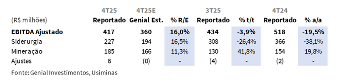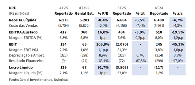 A Usiminas divulgou seus resultados do 4T25 em 12/fev. O EBITDA atingiu R$417m (+16% vs. Genial Est.; -3,9% t/t e -19,5% a/a), materialmente acima das expectativas, sustentado por desempenho de custos melhor que o esperado em ambas as divisões. O destaque operacional foi a melhora no COGS/t, especialmente na divisão de aço (-1,2% vs. Est.; -4,7% t/t; -8,3% a/a), compensando parcialmente os preços realizados ainda pressionados (-10,2% a/a). O FCF também foi uma surpresa positiva, atingindo +R$744m (+26% vs. Genial Est.; +22% t/t; revertendo queima a/a), refletindo geração operacional de caixa mais forte (+3% vs. Est.; +9% t/t; +4x a/a) e menor CAPEX (-14% vs. Est.; -2% a/a), permanecendo abaixo do ponto médio esperado do guidance de R$1,3b 25E (-5% vs. Est.).
