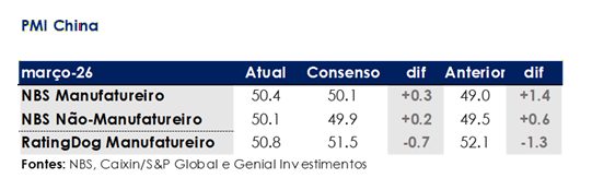 O PMI Industrial RatingDog (ex-Caixin-S&P Global) registrou 50,8pts. (-1,3p.p. m/m; -0,7p.p. vs. consenso BBG), recuando em base sequencial, sinalizando uma desaceleração na expansão fabril em relação à leitura de 52,1 de fevereiro, e vindo abaixo do esperado. A desaceleração é notável dado que a leitura do NBS se moveu na direção oposta no mesmo período, uma divergência que atribuímos em parte às diferentes composições de amostra das duas pesquisas (oficial vs. RatingDog). Como já citamos anteriormente, a pesquisa RatingDog tem maior peso em fabricantes do setor privado e orientados para exportação, que podem estar captando um tom mais cauteloso em meio à elevada incerteza geopolítica e aos custos de insumos crescentes.