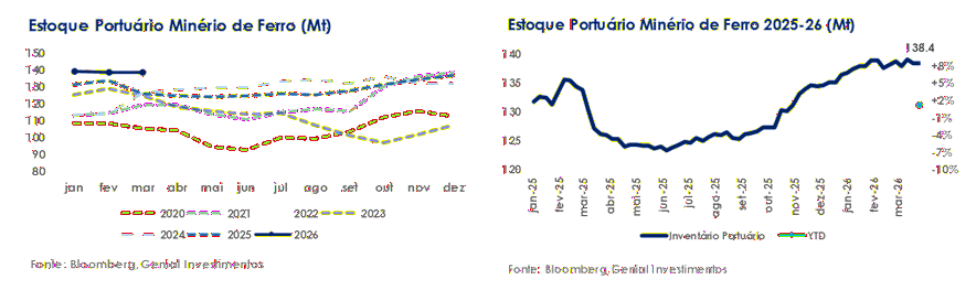 O quadro seaborne mais amplo permanece confortável, com os mineradores mantendo programas ativos de embarque. Com os preços do minério de ferro tendo subido nas últimas semanas, os incentivos de exportação permanecem fortes, e esperamos que os embarques aumentem na próxima semana. Continuamos vendo o lado da oferta como um vetor estrutural negativo para os preços: a combinação de (i) volumes resilientes dos grandes mineradores, (ii) oferta não-mainstream incremental (Onslow, ramp-up inicial de Simandou) e (iii) momentum brasileiro recuperável (após algumas fortes chuvas) deixa o mercado seaborne bem abastecido ao longo do 1S26E. A variável-chave a partir daqui permanece o ritmo de recomposição de estoques no nível das usinas. Dado apenas uma recuperação gradual na demanda de aço, vemos espaço limitado para qualquer drawdown sustentado de estoques no nível dos portos no curto prazo.