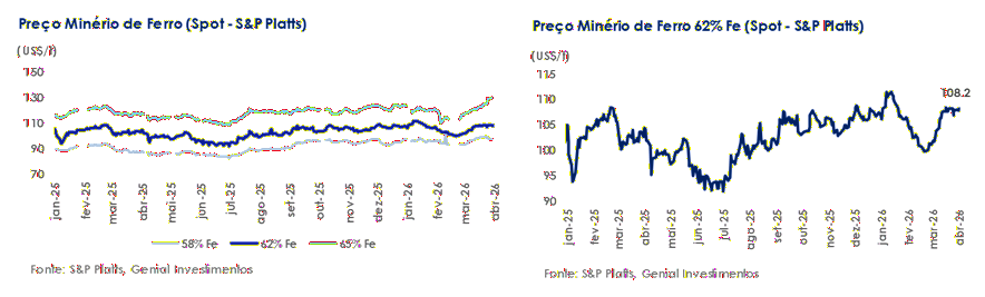 Nesse contexto, os preços do minério de ferro (DCE) encerraram a semana em US$107,2/t (-0,6% s/s), consolidando após negociar acima de US$110/t no início do mês, consistente com nossa leitura de que a recente força dos preços foi sustentada mais pelo sentimento e por fatores sazonais do que pelos fundamentos. (i) Estoques elevados nos portos; (ii) demanda fraca de aço; e (iii) oferta global abundante continuam a limitar o upside. Mantemos nossa visão de que preços em ~US$110/t são difíceis de sustentar com base apenas em fatores fundamentais e é improvável que persistam. Em nossa visão, antecipamos que os preços devem retomar sua tendência de queda anterior ao longo do 2T26E.