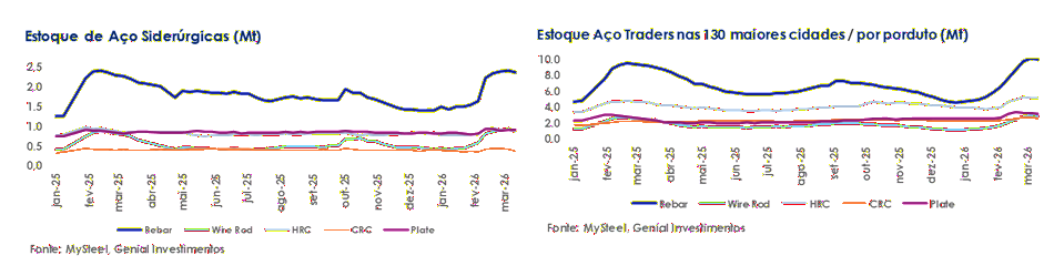 No geral, acreditamos que o declínio simultâneo nos estoques tanto de usinas quanto de distribuidores, juntamente com a produção crescente de vergalhão e HRC, sugere que a produção incremental está sendo absorvida downstream e não se acumulando em nenhum nível, consistente com uma retomada gradual da demanda de primavera (mar-mai). Nossa análise indica que o ciclo de desestocagem parece estar se reafirmando após uma breve pausa, apontando para uma dinâmica de oferta-demanda de curto prazo mais construtiva. No entanto, a visibilidade sustentada da demanda na temporada de construção da primavera será fundamental para determinar se essa tendência pode ser mantida tanto nas categorias de aço longo quanto plano. Permanecemos céticos neste ponto e continuamos esperando uma desaceleração da demanda a/a.
