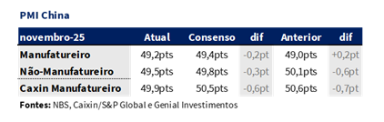 Divulgado no dia 30/Nov., no início desta semana pela S&P Global, o PMI Caixin de manufatura caiu para 49,9pts (-0,7pts m/m), retornando à zona de contração vs. Out. A leitura desaponta e sinaliza que, mesmo entre companhias privadas mais orientadas ao mercado, a atividade fabril já não consegue sustentar expansão em contexto de contração global e demanda interna enfraquecida.