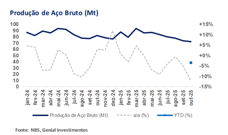 Os dados do NBS indicam que a produção de aço bruto recuou para 72Mt (-5% m/m; -12% a/a) em Out, indicando ajuste efetivo da oferta diante da demanda fraca, com cortes concentrados na rota integrada. A contração da produção de ferro gusa para 66Mt (-4% m/m; -8% a/a) confirma redução no ritmo dos altos-fornos (BFs), enquanto a venda de subprodutos de aço caiu apenas -1% a/a, sugerindo absorção parcial via estoques, e não retração do consumo.