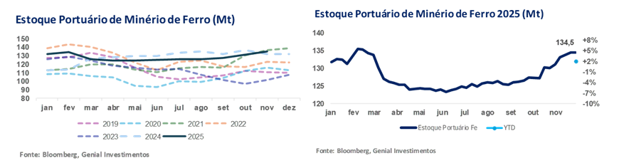 Na semana passada encerrada em 28/Nov., os estoques de minério de ferro nos 45 principais portos chineses retraíram marginalmente para 134,5Mt (-1% s/s), mantendo o padrão de estabilidade observado ao longo de Nov., situando-se +12% vs. média dos últimos 5A, em linha com um balanço estrutural ainda folgado. Observamos que (i) o volume estocado apresentou leve queda semanal, mas (ii) o throughput diário aumentou e o (iii) número de navios atracados subiu, indicando continuidade de chegadas robustas e ritmo limitado de destocagem. Nas usinas, os estoques também recuaram na semana, movimento coerente com a queda persistente na lucratividade do setor siderúrgico, que vem contendo a demanda por entregas físicas.