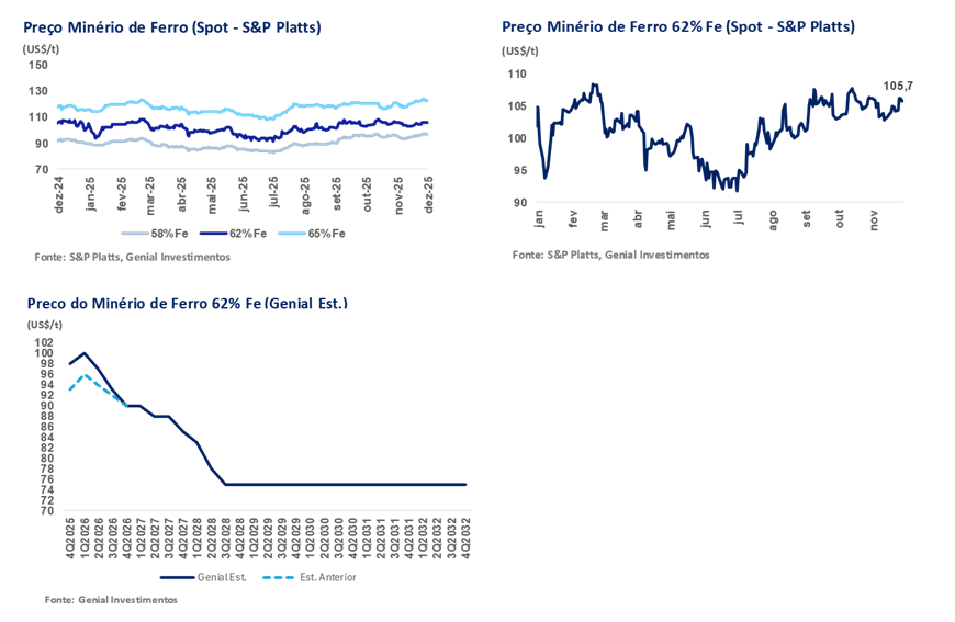 Diante do comportamento mais resiliente dos preços do minério de ferro no 2S25, optamos por revisar novamente nossas premissas para a curva futura 62% Fe. Subsequente ao ajuste realizado no último relatório, em que elevamos a referência do 4T25E para US$98/t (vs. ~US$90/t anteriormente), partimos de uma base maior para 2026E e incorporamos, agora, a readequação da curva 1T26E para US$100/t (vs. ~US$93/t anteriormente), refletindo o efeito sazonal típico de restocking anterior ao Ano-Novo Lunar e a redução temporária de oferta causada pelas monções entre o 4T25-1T26, já precificados de forma justa no preço do contrato futuro de Jan na DCE (~US$110/t; +3% vs. spot) . Dessa forma, nossa média passou para US$95/t 26E (+3% vs. anterior), incorporando esse viés menos depreciativo no curto prazo.