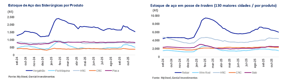 No aço, os estoques combinados dos cinco principais produtos caíram para 4,0Mt (-2,9% s/s), sexta queda seguida e o menor nível em 10M. A taxa de utilização dos altos-fornos (BFs) recuou para 88,6% (-0,5p.p. s/s), acompanhando a queda para 2,4Mt/dia (-0,3% s/s) na produção de ferro-gusa, refletindo o início de manutenções e margens mais apertadas. Acreditamos que as usinas têm ajustado a oferta de forma tática, preservando margem variável sem realizar cortes profundos que encarecem a reativação. Já taxa de utilização dos fornos elétricos (EAFs) caiu para 51,6% (-1,6p.p. s/s), indicando perda de tração da rota EAF em meio a demanda enfraquecida, custos rígidos de energia e sucata e produção intermitente “liga-desliga”.