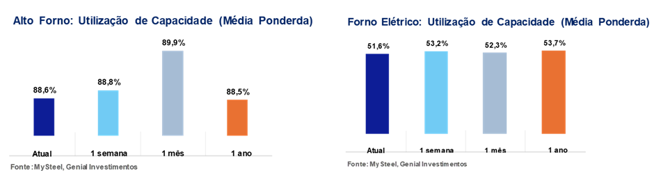 Nessas condições, o ajuste via entrada de usinas em manutenção nos parece ser um artifício menos oneroso, pois reduções maiores exigiriam parada profunda do alto-forno, o que elevaria o custo fixo unitário e implicaria reativação custosa do equipamento. Assim, avaliamos que operar na faixa de 88–89% permite atenuar a produção marginal que destrói rentabilidade sem desmontar capacidade e mantendo prontidão para retomada caso o spread se recupere. Portanto, o movimento atual não busca reequilibrar oferta, mas sim evitar que a última tonelada produzida opere com margem nula ou negativa, caracterizando gestão tática.