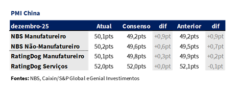 Em 30/Dez, o NBS divulgou dados indicando que o PMI de manufatura subiu para 50,1pts (+0,9pt m/m; +1pt vs. consenso BBG), voltando a superar o limiar de 50pts e marcando a primeira leitura em expansão desde Mar., além de surpreender positivamente as expectativas de mercado. A melhora do headline reflete uma combinação de demanda doméstica mais firme e suporte de políticas, que por sua vez começam a se refletir na dinâmica de produção. Ainda assim, o atingimento da zona de expansão nos parece mais incipiente do que conclusivo, com indicadores subjacentes sugerindo uma recuperação ainda desigual entre setores e portes de companhias.