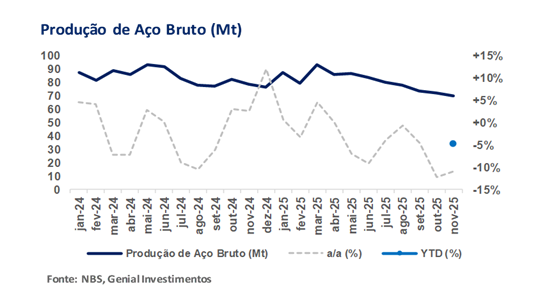 Produção de aço bruto da China recua -11% a/a em Nov/25.
