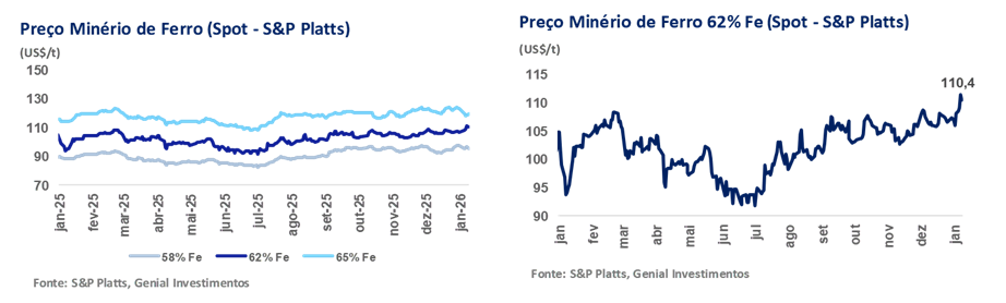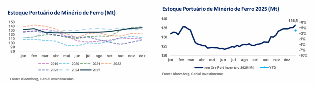 Embora, no início de 2025, os embarques tenham sido temporariamente afetados por eventos climáticos e disrupções geopolíticas, os fluxos de despache não apenas se estabilizaram como também registraram aumento relevante de produção no 2S25. Como resultado, o ano terminou com volumes da Austrália essencialmente estáveis vs. 2024, enquanto os embarques do Brasil para a China aceleraram +4,3% a/a, impulsionados principalmente pela Vale, que retornou a níveis recordes de produção observados em 2019. Olhando para 2026, acreditamos que, com o início da estação chuvosa no eixo Brasil–Austrália, as companhias de mineração tendem a reduzir os níveis de embarque vs. fechamento do ano nos próximos meses — este é o ponto de inflexão. Dado que os estoques estão muito elevados, será essencial observar, durante o feriado do Ano Novo (17/Fev. a 3/Mar.), quanto as usinas conseguirão retirar desse volume retido nos portos, considerando que o fluxo de chegadas será interrompido.
