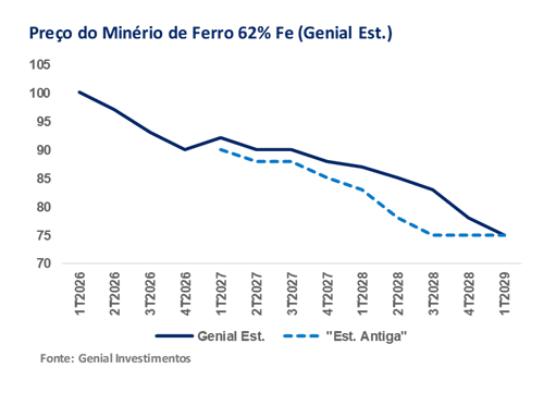 Apesar de os preços spot do minério de ferro estarem negociando próximos a US$110/t, mantemos nossa premissa de preço em US$95/t 26E como média anual (flat vs. Est. Antiga), uma vez que nosso framework segue ancorado em fundamentos e continua apontando para um equilíbrio oferta–demanda estruturalmente mais fraco. Reconhecemos que estamos posicionados no extremo mais bearish do espectro vs. outras casas sell-side, com o consenso situado em uma faixa de US$100–105/t 26E. A produção de aço da China segue em desaceleração (Nov. aço bruto: -11% a/a; Jan.–Nov.: -4% a/a; +0,5p.p. pior vs. Est.), o que implica uma redução anualizada de ~50Mt na demanda por minério de ferro, em meio a um processo contínuo de ajuste do setor imobiliário e a um controle mais rígido de política sobre a produção de aço. Em nossa visão, a resiliência atual dos preços é amplamente cíclica e transitória — sustentada por (i) recomposição de estoques pré-Ano Novo Lunar, (ii) ventos favoráveis de câmbio e (iii) posicionamento especulativo — e não por uma melhora dos fundamentos, o que justifica a manutenção de uma média de preço mais conservadora para 2026.