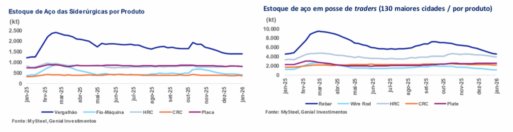 No nível dos distribuidores, a destocagem persistiu, ainda que em ritmo mais lento vs. semana anterior. Os estoques mantidos por traders e centros de distribuição nas 132 cidades monitoradas recuaram para 14,3Mt (-2% s/s), estendendo o processo de ajuste até o fim de Dez. A redução voltou a ser liderada pelos produtos longos, com vergalhão em 4,6Mt (-2% s/s) e fio-máquina em 1,1Mt (-2% s/s), enquanto os produtos planos também apresentaram queda, com HRC em 3,9Mt (-3% s/s) e CRC estável em 2,2Mt (flat s/s); chapas grossas recuaram marginalmente para 2,5Mt (-1% s/s). Em termos gerais, entendemos que a combinação de alívio gradual do lado da oferta nas usinas e destocagem contínua liderada pela ponta downstream, o que sugere que o processo de limpeza de estoques segue predominantemente orientado pelo varejo, com distribuidores ainda priorizando disciplina de estoques ao longo do período sazonal de menor demanda. Os produtos longos continuam a apresentar melhor giro relativo na cadeia de distribuição, enquanto os produtos planos, apesar da normalização recente da produção, permanecem mais expostos à demanda de inverno, que é enfraquecida.